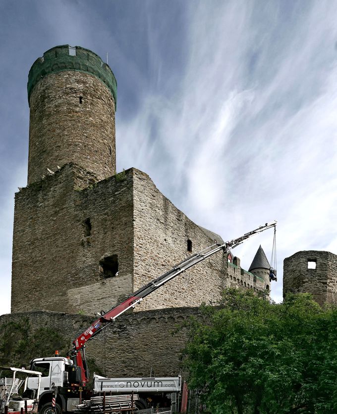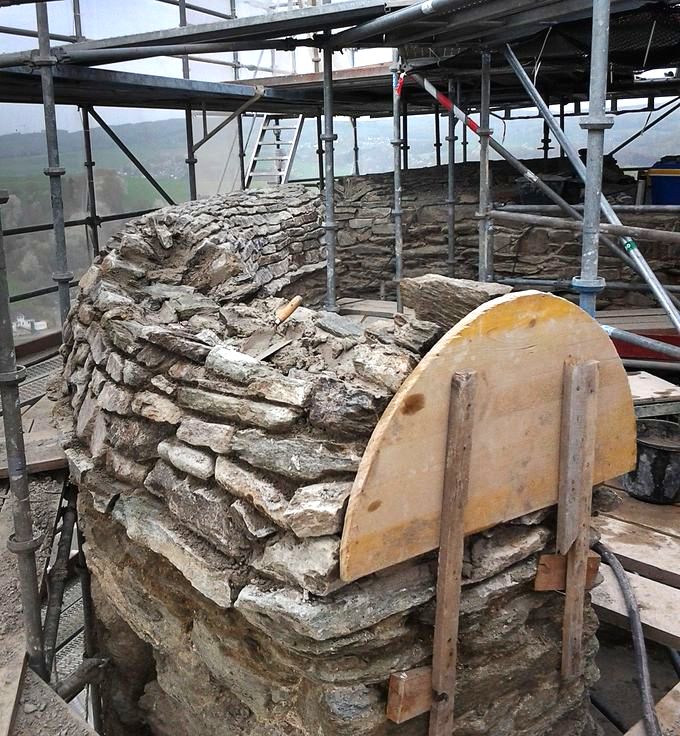Die Wiederaufmauerung erfolgte nur untergeordnet mit intaktem Altmaterial. Überwiegend wurde Neumaterial verwendet, welches entsprechend dem Bestand geliefert und vor Ort in hammerrechte Quader gespalten wurde. Die neuen Mauerabschnitte folgen den bestehenden historischen Baufugen. Das Fugenbild wurde, auch unter Verwendung von Zwickelsteinen, dem historischen Bestand angepasst und wie im originalen Mauerwerk die Lager- und Stoßfugen hohlraumfrei verfüllt.