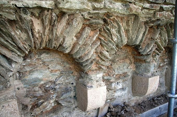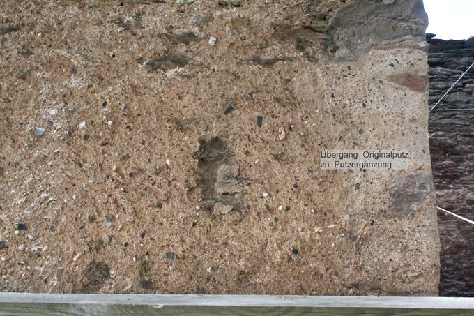 Die an der Maueroberfläche, sowohl im Innen-, als auch im Außenbereich noch vorhandenen bauzeitlichen Kalkmörtelputze wurden von partiell aufliegenden jüngeren Putzen vorsichtig mittels Skalpell befreit. Für größere Fehlstellen innerhalb geschlossener Flächen wurde ein Ergänzungsmörtel auf Basis des Werktrockenmörtels der Verfugung gemischt. Als Körnung wurden sowohl runde, als auch gebrochene Splittkörner der Umgebung beigemengt und der Ergänzungsmörtel ansatzloß, also auf Null auslaufend an den Bestand angearbeitet. Die Übergänge wurden eingeschlämmt. Die originalen und zum Teil schon zurück gewitterten Putzflächen wurden mit einer lösemittelhaltigen Kieselsäure gefestigt. Nach der Ausreaktion der Kieselsäure erfolgte die Konsolidierung der Randbereiche, ebenfalls mit dem Werktrockenmörtel der Verfugung sowie das hinterfüllen von hohlliegenden Bereichen. Durch die zum Teil dunkle Patina der Orginalflächen fielen die neuen Ergänzungen farblich aus dem Rahmen und wurden mit "Aqua Sporca" egalisiert.