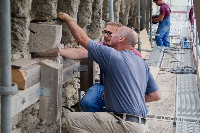 Da sich die Neuteile in dem vom Regenwasser geschädigten Mauerbereichen befanden, wurde zum Einbau der Konsolsteine seitlich Packer für die Hinterfüllung der Konsolen und des Mauerwerks gelegt und mit Kalkmörtel verpresst. Die Verfüllung der Hohlräume im Mauerwerk erfolgte lagenweise über Packer. Neue Konsolsteine mit einer geringeren Einbindetiefe, im Bereich der originalen Brüstungsmauer, wurden zusätzlich mit Ankerdornen aus Edelstahl im Mauerwerk rückverankert. Die sichtbaren Flächen der Konsolsteine wurden zum Angleich an die direkt angrenzenden Bruchsteinbereiche nachgearbeitet. Optisch störende Regelmäßigkeiten wurden hierdurch behoben.