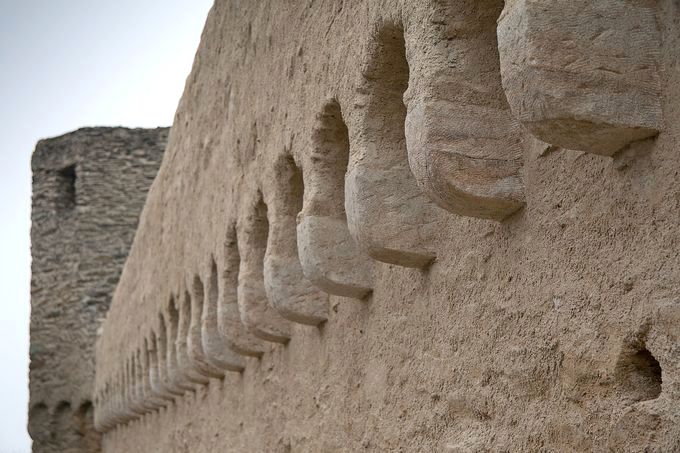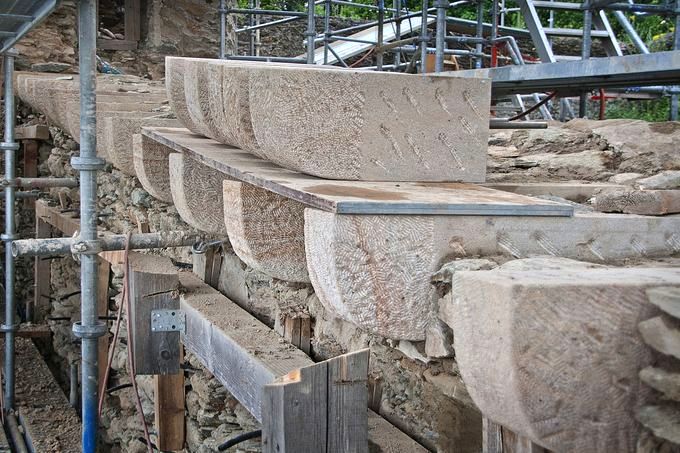 Für den Austausch defekter Konsolsteine an den Bogenfriesen wurde ein Ibbenbürener Sandstein festgelegt.