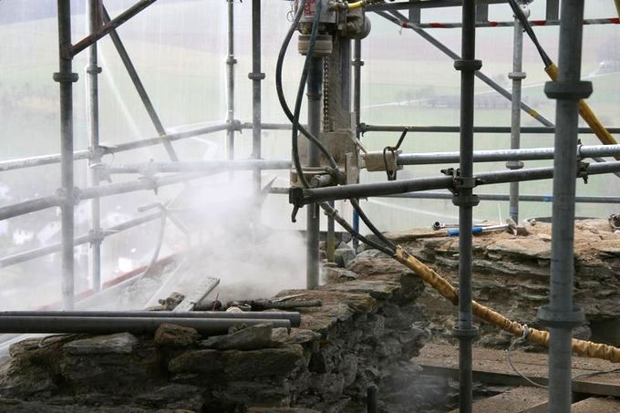 Für die statische Sicherung des Mauerwerks wurden senkrechte Bohrungen von oben in das Bruchsteinmauerwerk gesetzt. Die verbauten Nadelanker Werkstoffnummer: HUGWS975A4, Ø 12 mm) wurden bis auf ca. 4,00 m Tiefe verankert und mit Abstandshaltern fachgerecht in die Kernbohrung eingebaut. Die Haftverankerung erfolgte mit einer HS- Zementsuspension, welche über Injektionsröhrchen erfolgte. Der Grad der Verfüllung wurde durch Entlüftungsröhrchen überwacht und eventuell auftretende Verschmutzungen umgehend behoben.