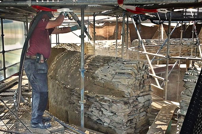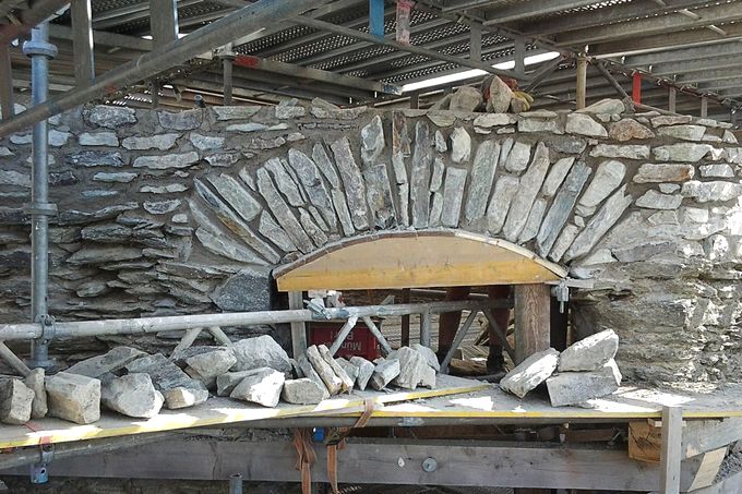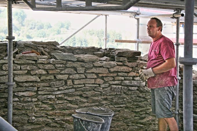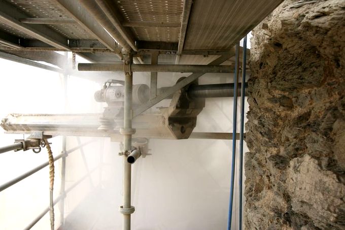 Die Verfugung der Bruchsteinfugen erfolgte maschinell im Trockenspritzverfahren. Aufgrund der hohen Auftragsmenge musste mit dem geringst möglichen Wasseranteil gespritzt werden und unmittelbar mit dem Nacharbeiten der Flächen begonnen werden. Im Zuge der Verfugung wurden die historischen Gerüstdübellöcher von der Bearbeitung ausgespart. Beim Nacharbeiten erfolgte dann eine kreisförmige Anmodelierung der Ränder an die Verfugungsfläche. Historische Bautrennfugen wurden mit einem deutlich sichtbaren Kellenschnit in der Verfugungsfläche markiert.