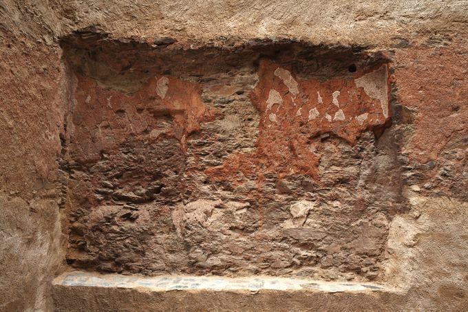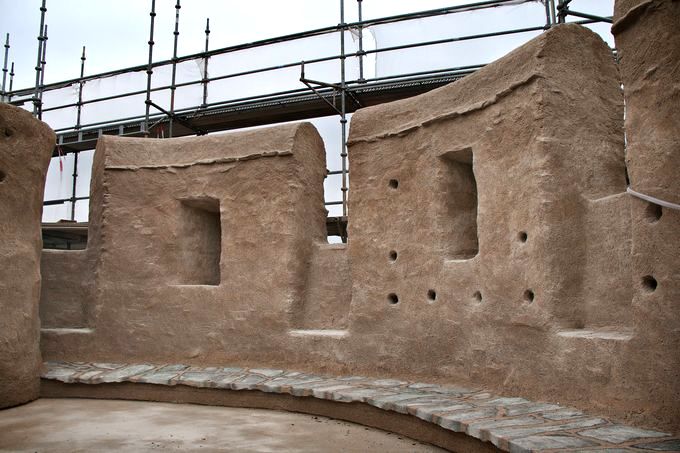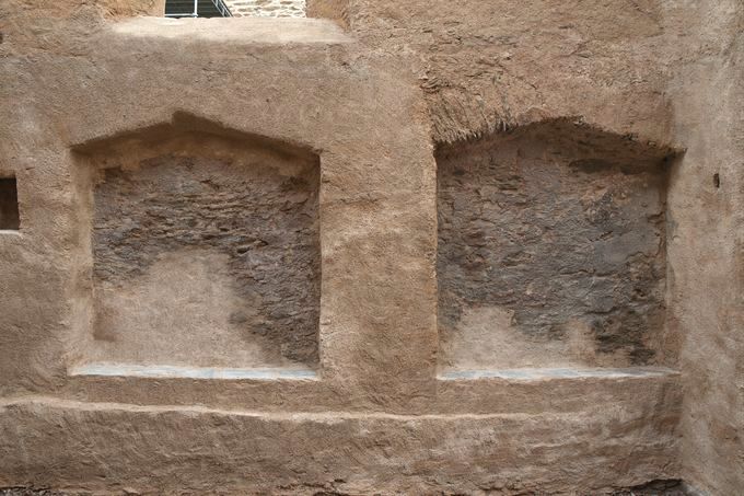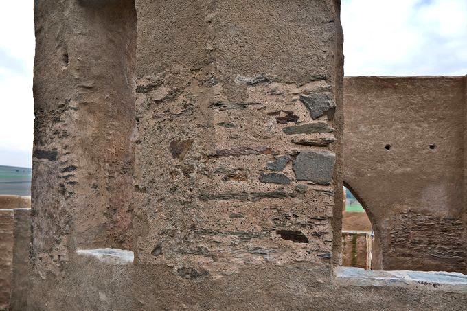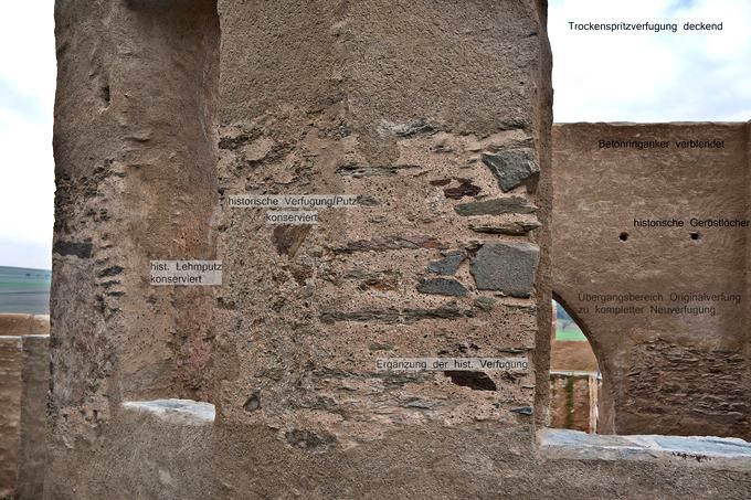 Die an der Maueroberfläche noch befindlichen bauzeitlichen Lehmmörtelputze wurden von aufliegenden jüngeren Putzen vorsichtig mittels Skalpell befreit. Sandende und mürbe Oberflächen wurden mit einer wässrigen Lehmschlämme gefestigt. Die Randbereiche wurden mit einem auf den vorliegenden Bestand abgestimmten Lehmmörtel angeböscht und so ein weiterer Substanzverlust verzögert. Hohl liegende Bereiche innerhalb der Putzflächen wurden hinterfüllt. Für die Dauer der Mauerwerkskonsolidierung wurden die Lehmmörtelbereiche zusätzlich mit vorgehängten Gitternetzfolien gesichert.